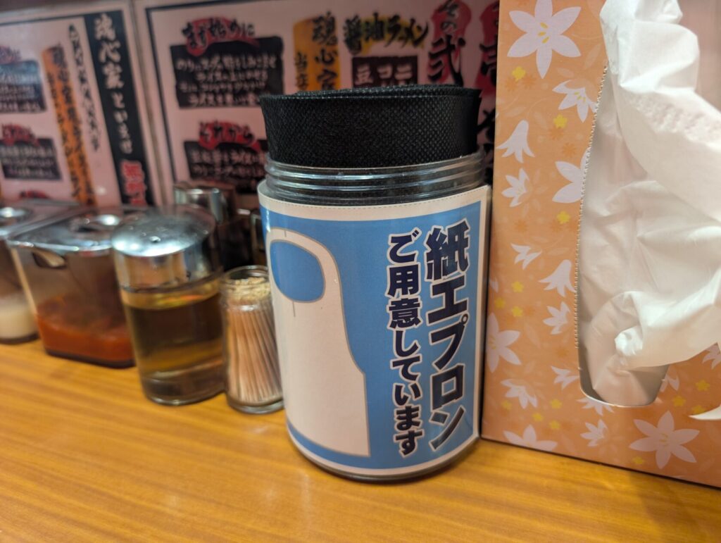都会は紙エプロン提供多いんですかね、いい服着てる方も多いですからね、助かるサービスです