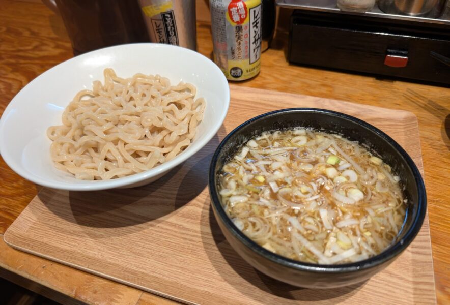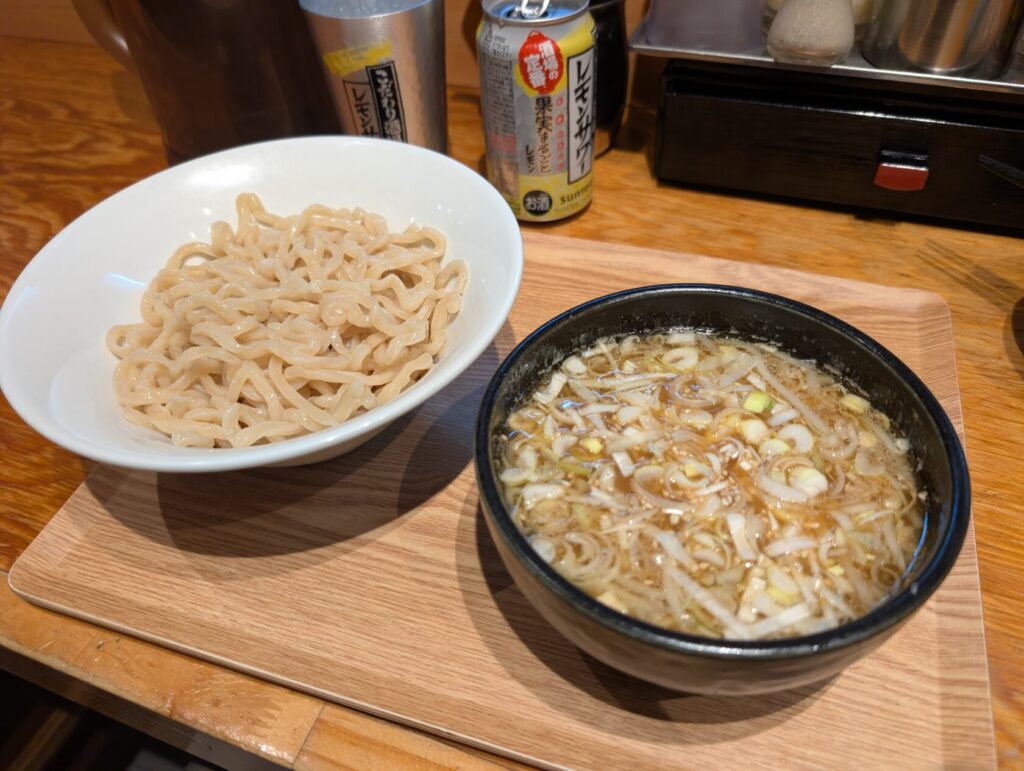 つけ麺は太麺で食べ応え良し、しっかり味でレモンサワーが進む!
