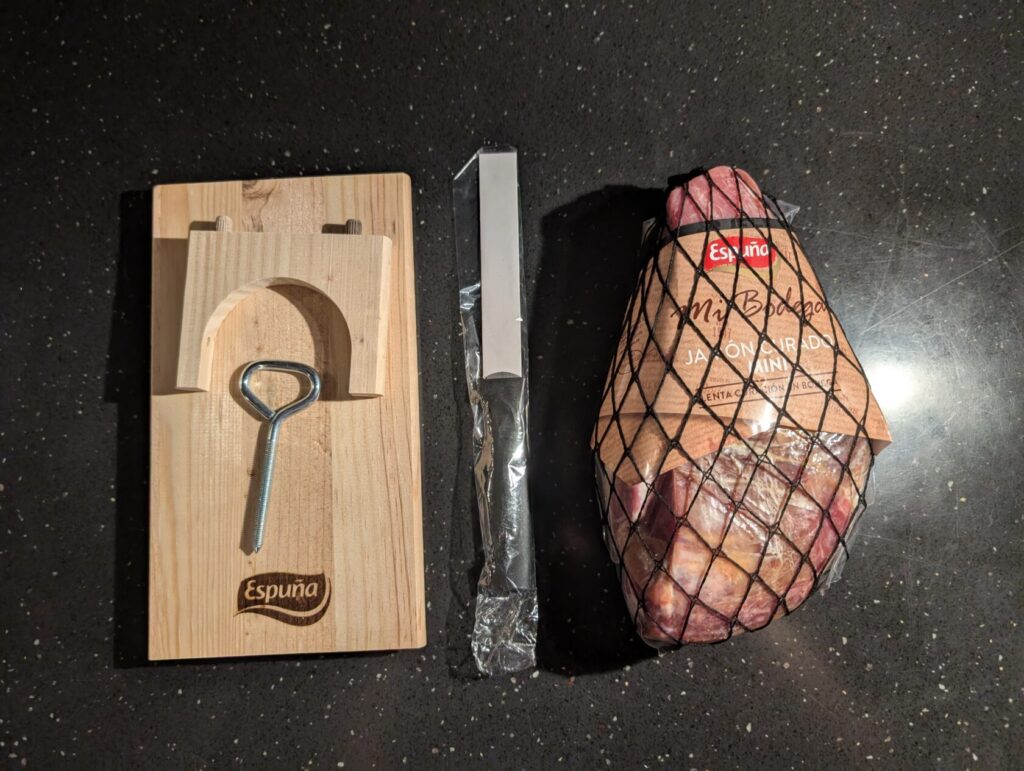 カタログギフトの恩恵でミニサイズの生ハム原木「Espuna JAMON CURADO MINI」を頂きました
