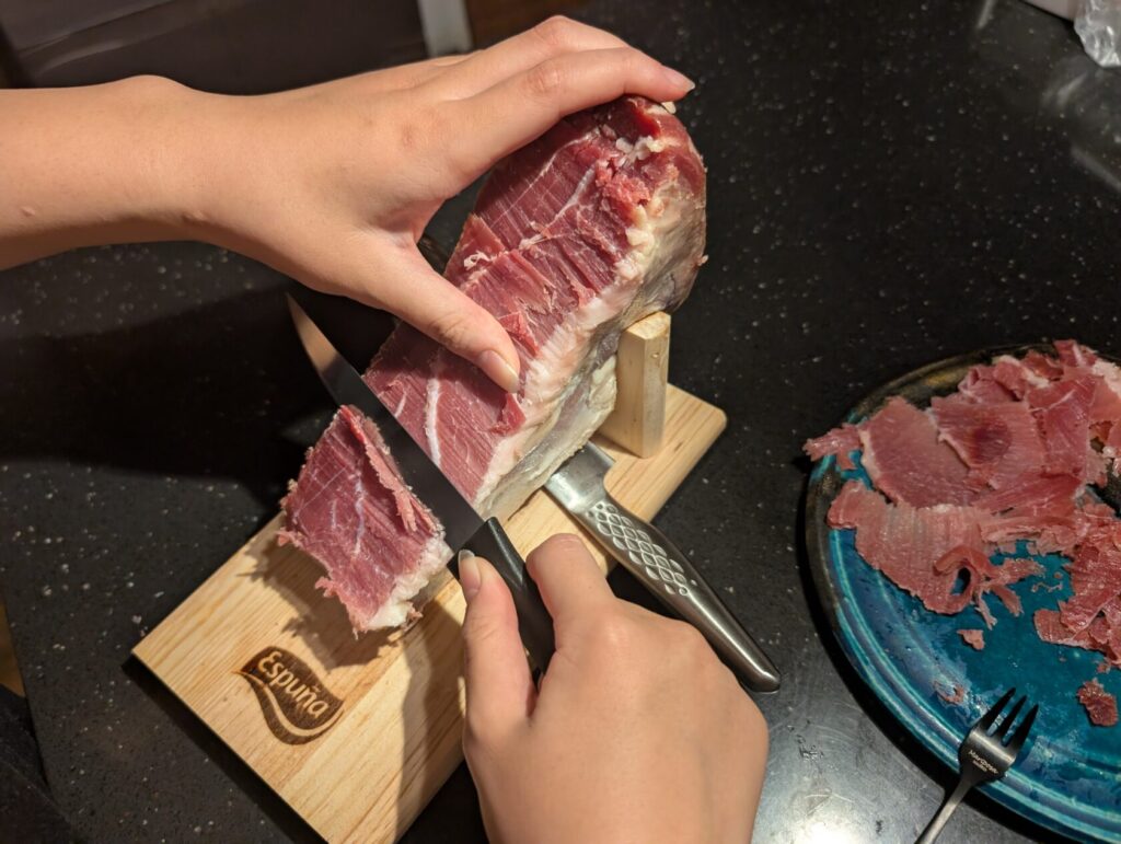 職人さんが生ハムを切るのを見てると簡単そうに薄く大きくキレイに切っていますので、脳内でアレをイメージして…